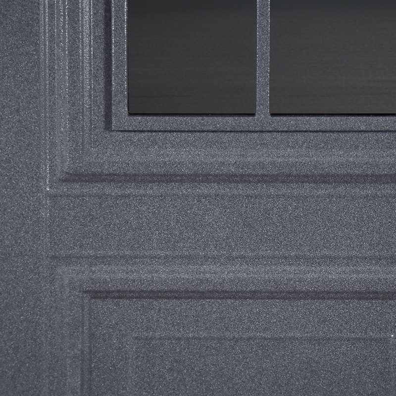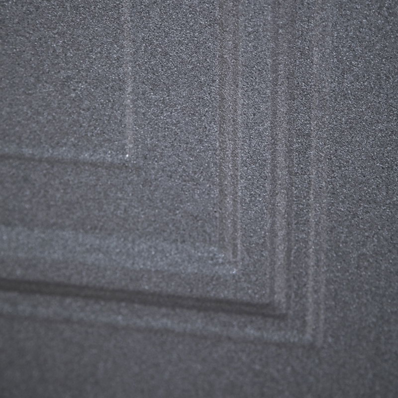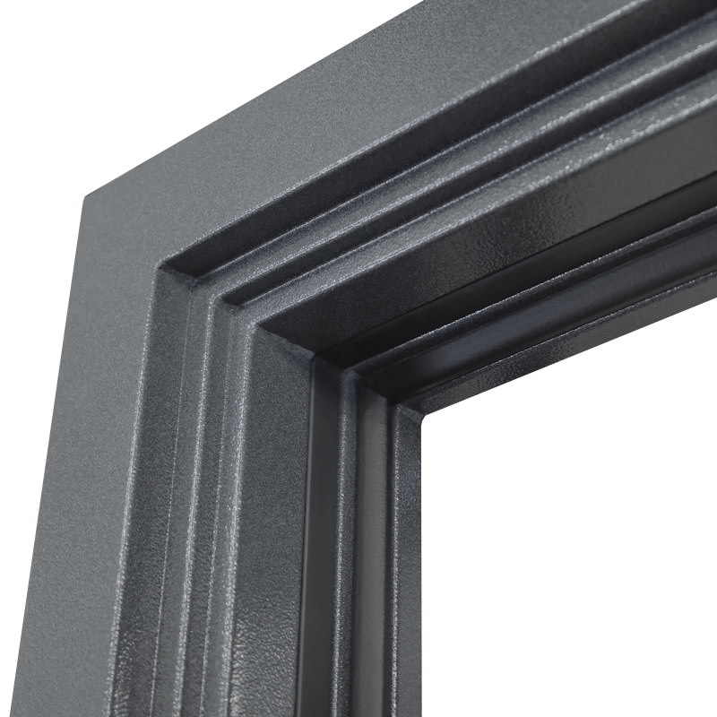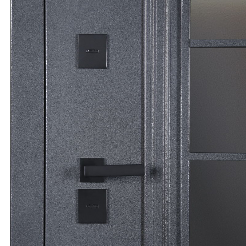2 слоя покрытия: первый слой - цинкогрунт, второй слой - порошковое покрытие. Цвет "букле графит". Лист металла 1,5 мм. Декоративный штамп на металле. Порошковое покрытие. Английская решетка. Тонированный стеклопакет.