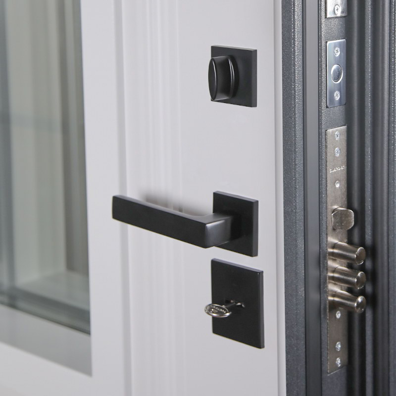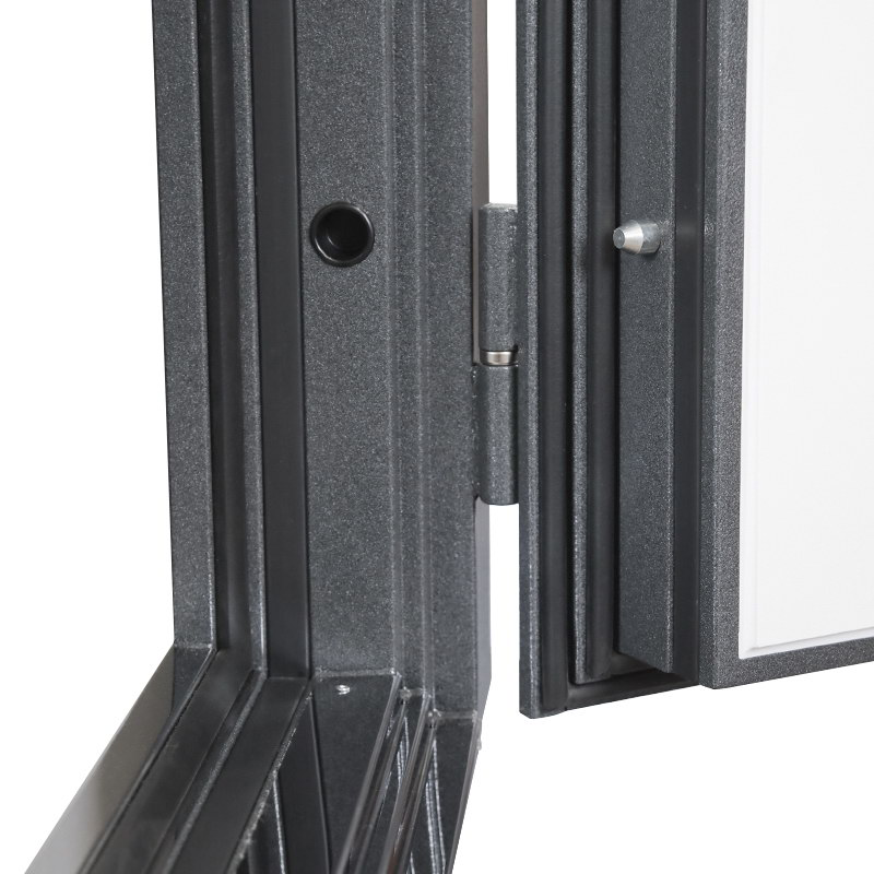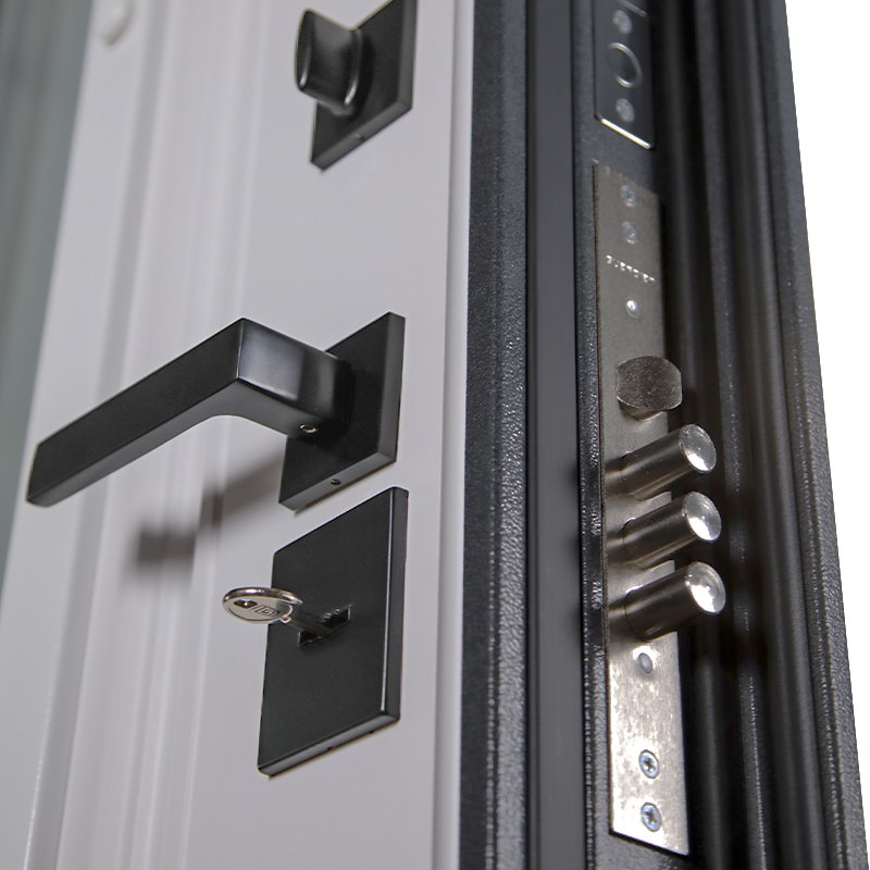Штырь противоъёмный (3 шт.). Порог из нержавеющей стали (цвет "хром"). На всех сувальдных замках накладки со шторками-автомат.