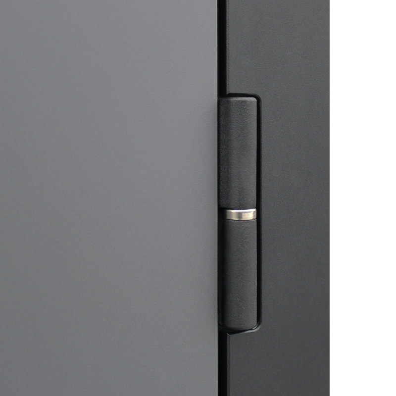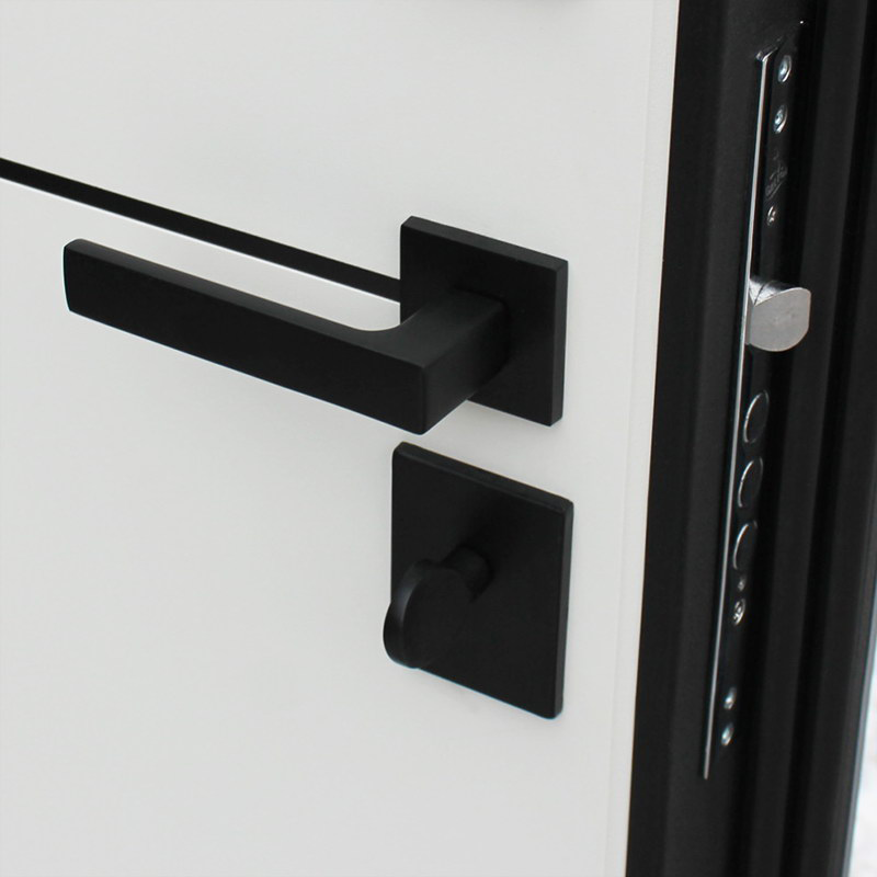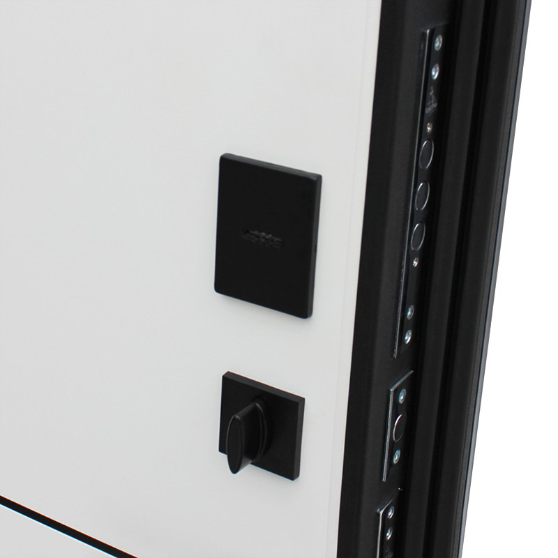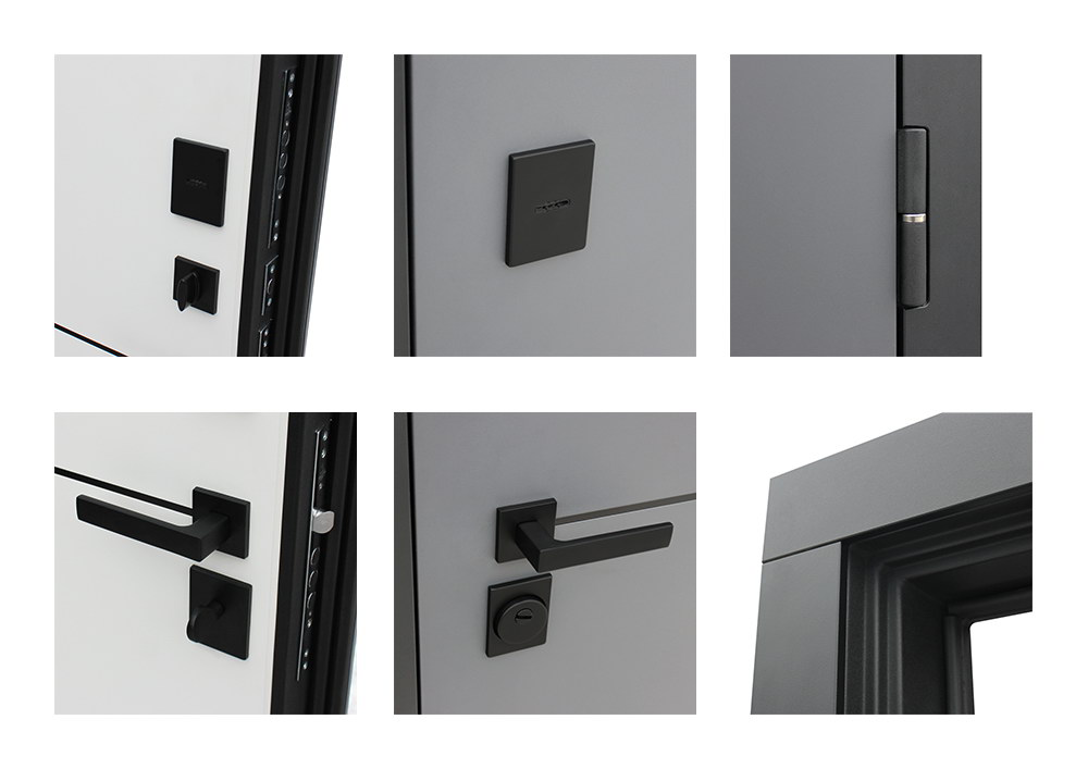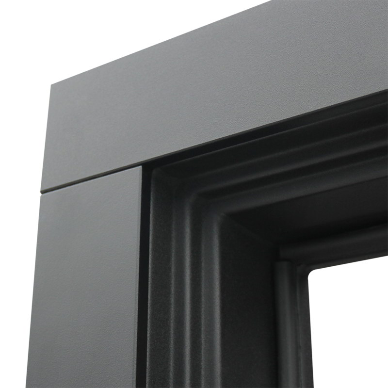 Порошковое покрытие "муар черный". Наружный лист металла 1,5 мм. Экошпонированная панель МДФ 10 мм (цвет «альянс TF 40 IE-X-89U графит»). Декоративный молдинг 10 мм (цвет «черный»).