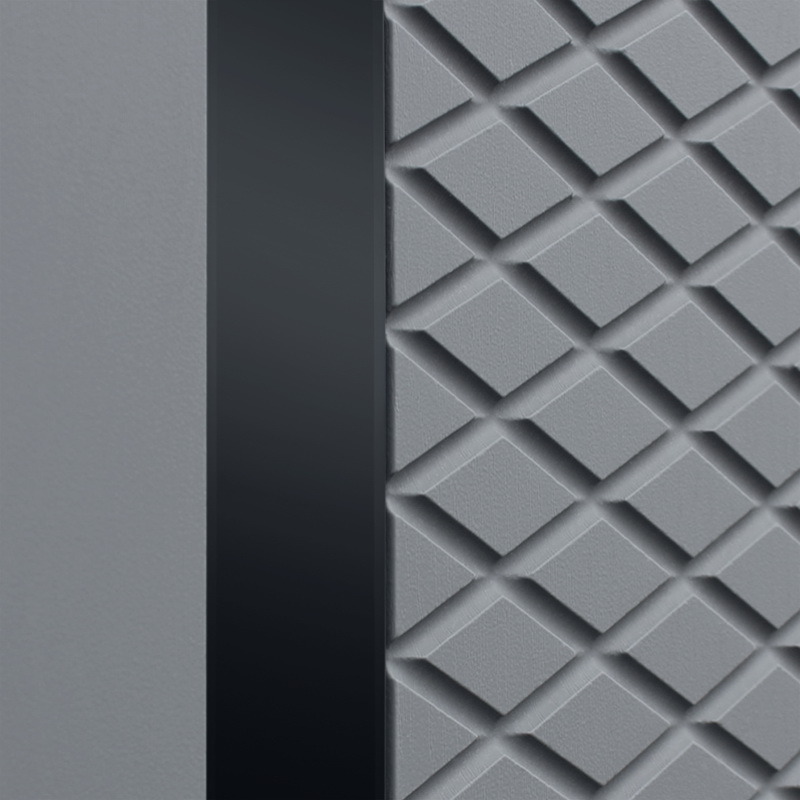 Экошпонированная панель МДФ 10 мм. Цвет "лайт софт грей". Вертикальная вставка из черного глянцевого лакобеля.