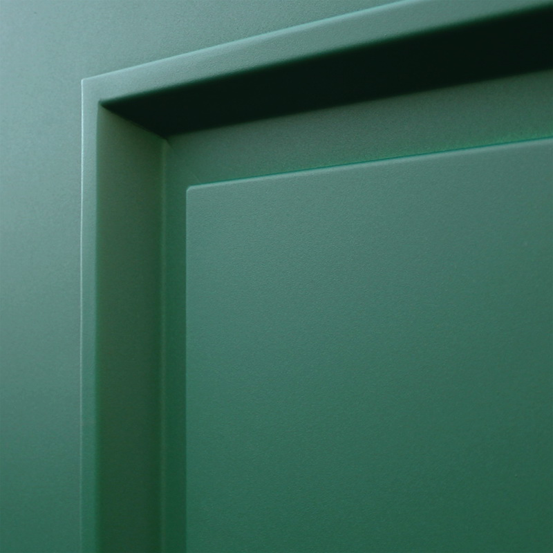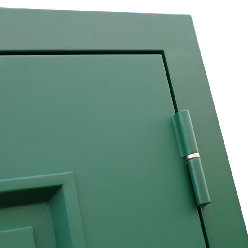 Два цвета покраски коробки: внешняя сторона - "муар зеленый", внутренняя сторона - "муар серый". Два слоя покрытия полотна: первый слой - цинкогрунт, второй слой - порошковое покрытие "муар серый". Лист металла 1,8 мм. Два слоя покрытия. Металлофиленки (2 шт.).