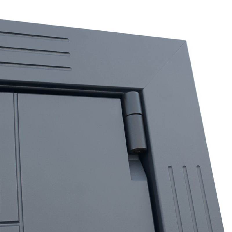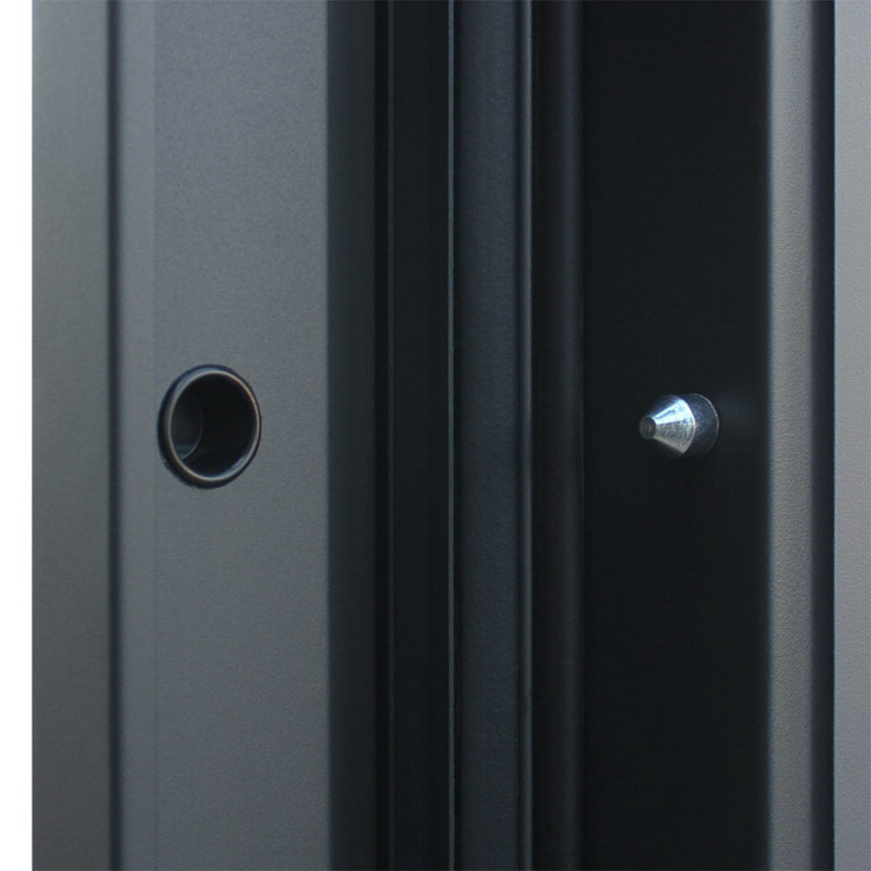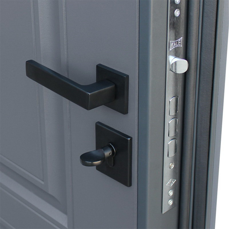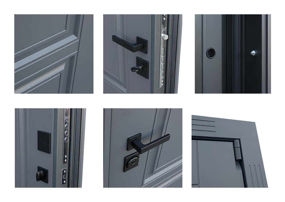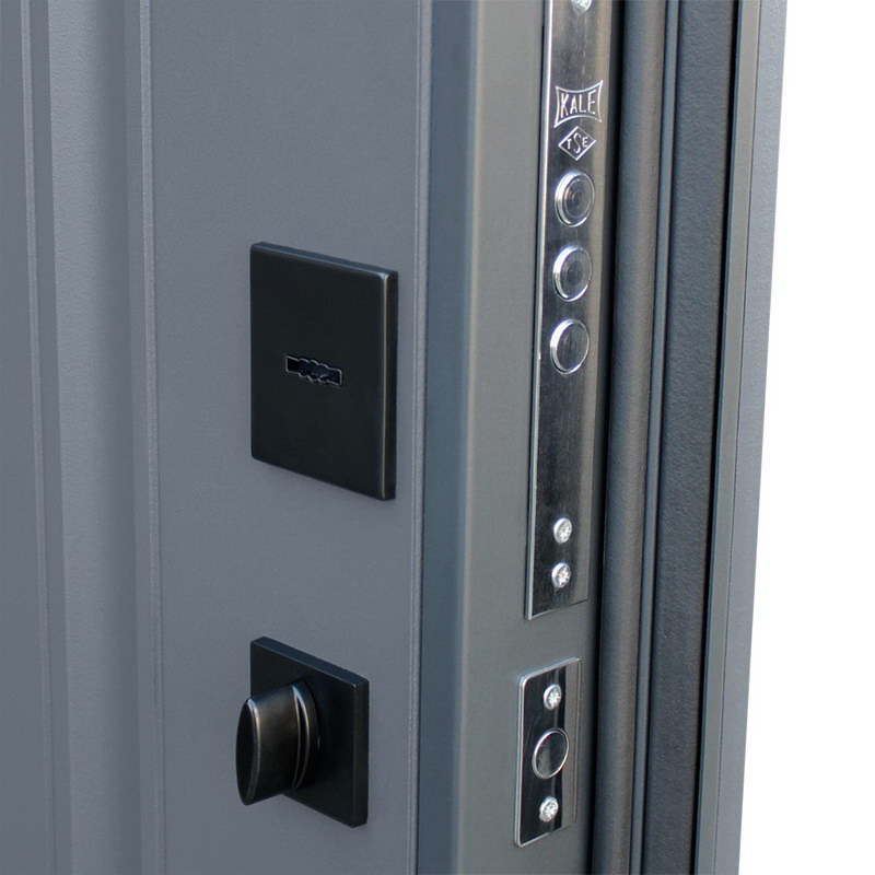 Короб утолщённый, гнутый профиль. 3 контура уплотнения. Толщина (глубина) коробки 117 мм. Лист металла 1 мм под внутренней панелью. Евроцилиндр К-В (перфокарта). Броненакладка врезная. Штырь противосъемный (3 шт).