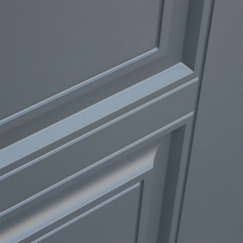 Порошковое покрытие "муар серый". Лист металла 2 мм. Панель МДФ 16 мм. Объемная фрезеровка. Цвет "графит". Наличник МДФ: толщина 16 мм, ширина 85 мм.