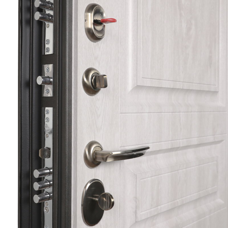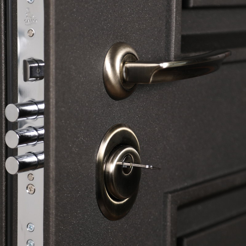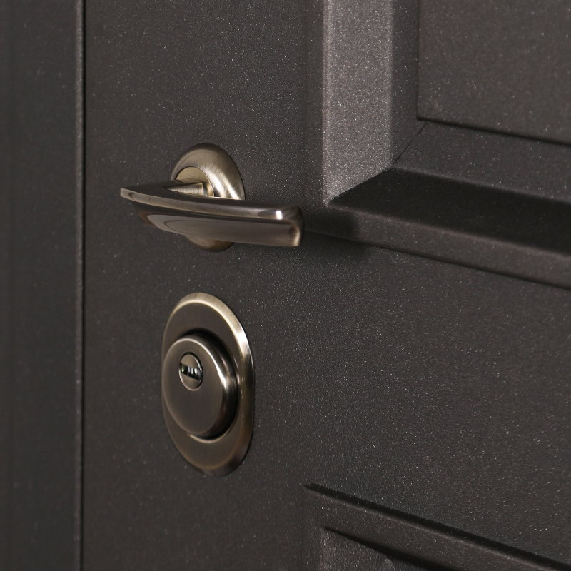 Евроцилиндр К-В перфокарта. Броненакладка врезная. Штырь противосъемный (3 шт). Накладки со шторками-автомат. Порог из нержавеющей стали (цвет "хром"). Наличник фигурный.