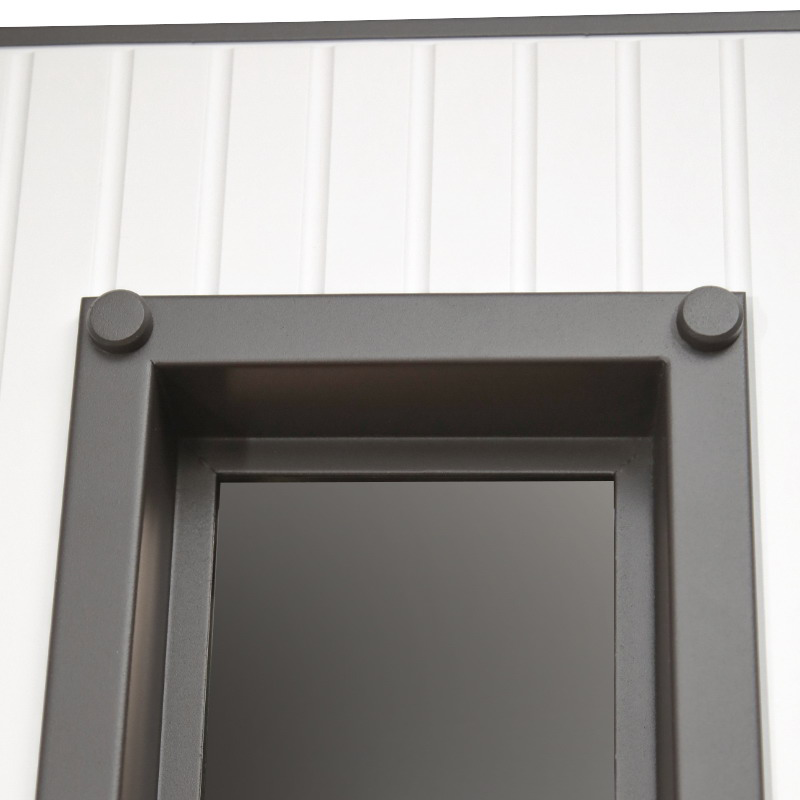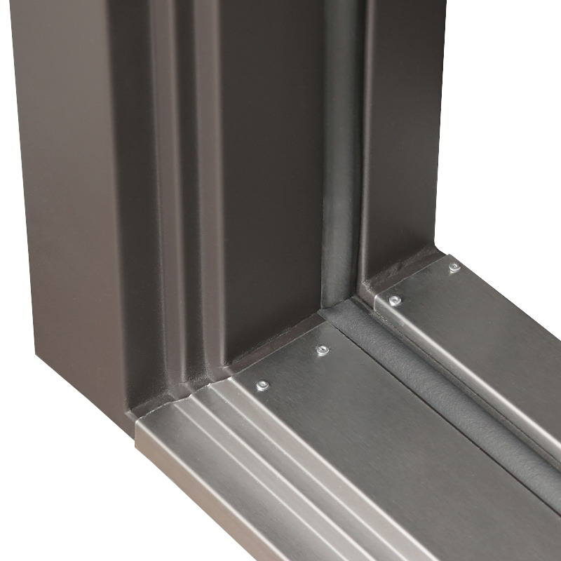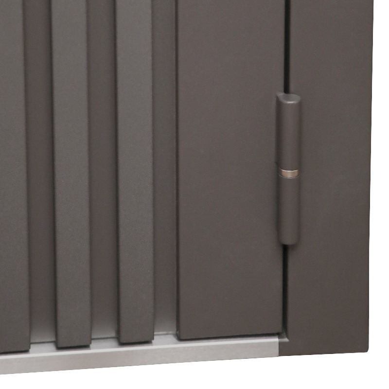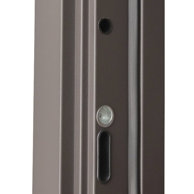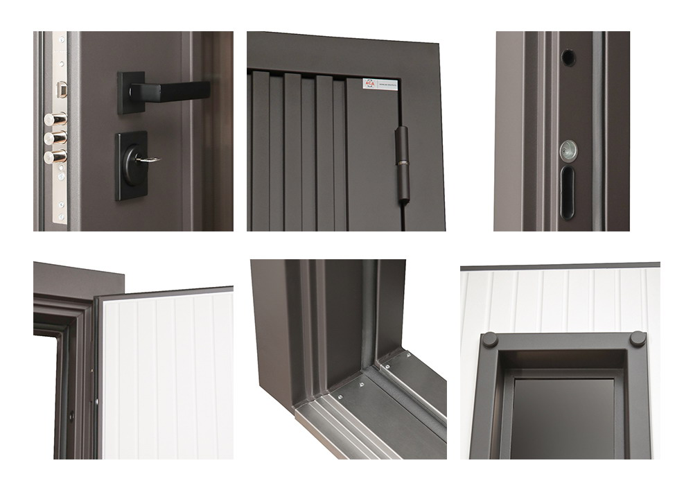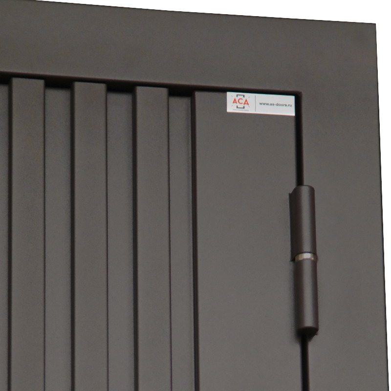 Два слоя покрытия металла: первый слой - цинкогрунт, второй слой - порошковое покрытие "муар коричневый". Лист металла 1,8 мм. Вертикальные рейки из металла. Два слоя покрытия. Тонированный двухкамерный стеклопакет.