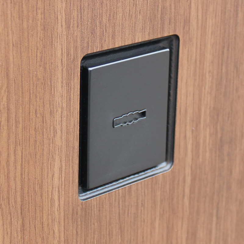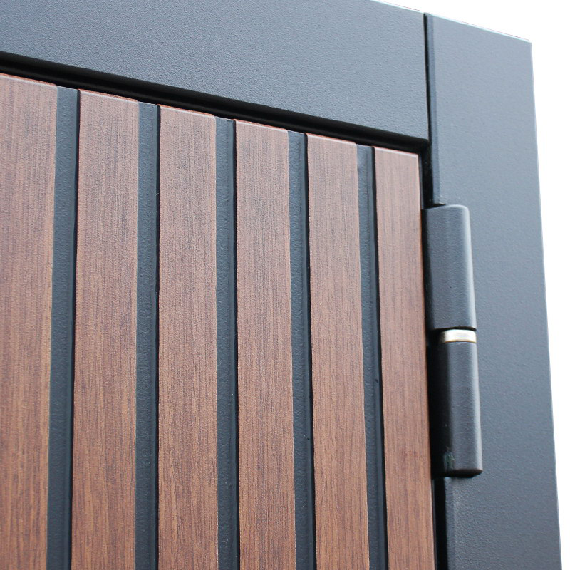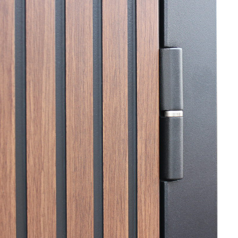 Порошковое покрытие "муар черный". Лист металла 1,5 мм. Экошпонированная дизайнерская панель МДФ 10 мм. Линейная фрезеровка. Цветовая комбинация: "дуб кантри темный", черное патинирование по фрезеровке.