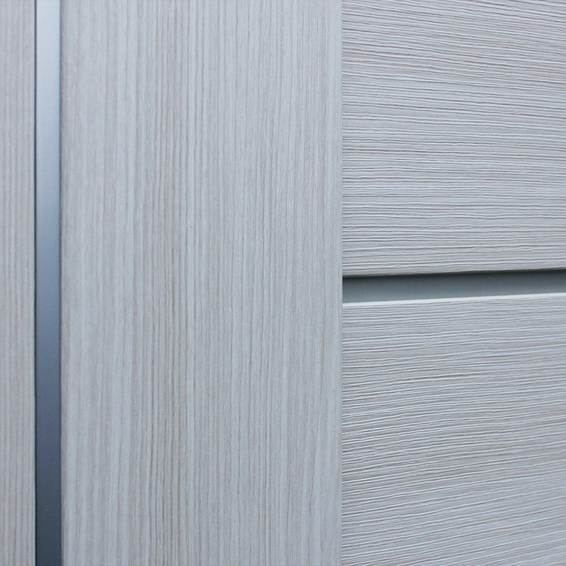 Экошпонированная сборная панель МДФ 16 мм. Горизонтальные вставки из светлого матового стекла. Вертикальная вставка из молдинга в цвете "хром". Цвет: «белая лиственница»