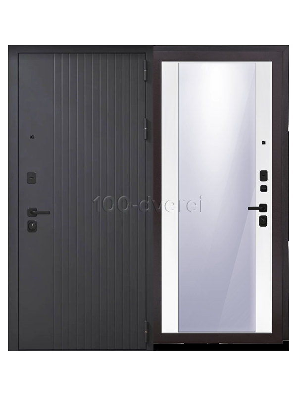 Толщина металла 1,4 мм, дверной глазок, ночная задвижка, фурнитура хром прямоугольная 17 серия, декоративные накладки с защитой от продувания, комплект ключей.