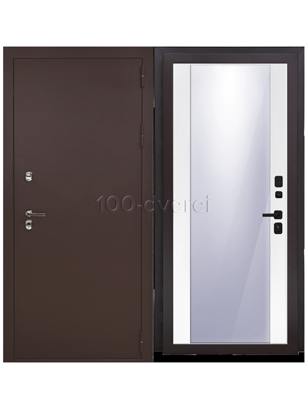 Толщина металла 1,5 мм, ночная задвижка, фурнитура хром овальная, декоративные накладки с защитой от продувания, комплект ключей.