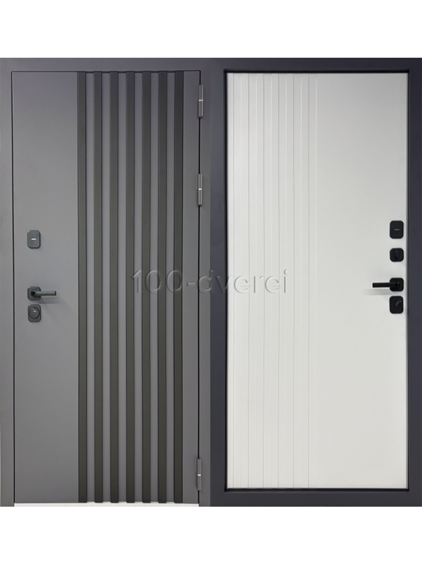 Дверь MXD ТЕРМО — это дизайнерская входная дверь класса люкс. Она изготовлена из нескольких листов стали, имеет звукоизоляцию и теплоизоляцию, утеплённый короб и полотно, защищающее от сквозняков и шумов. Внешняя отделка двери выполнена в стиле букле антрацит, а внутренняя — в виде ламинированной МДФ-панели белого матового цвета.
